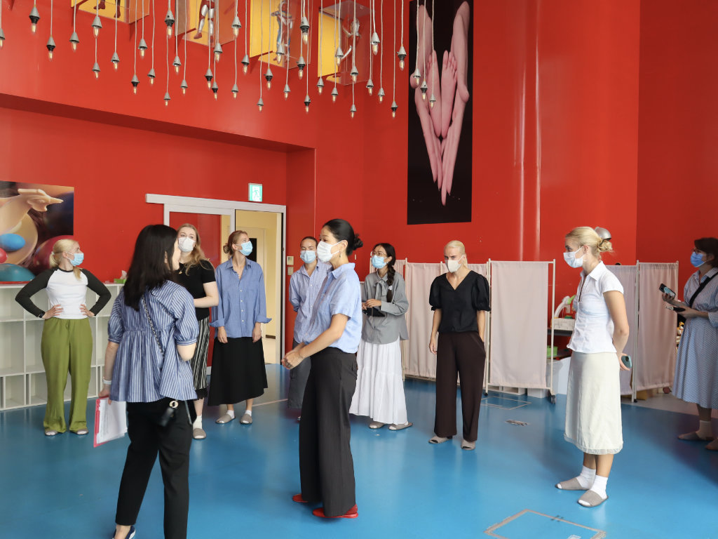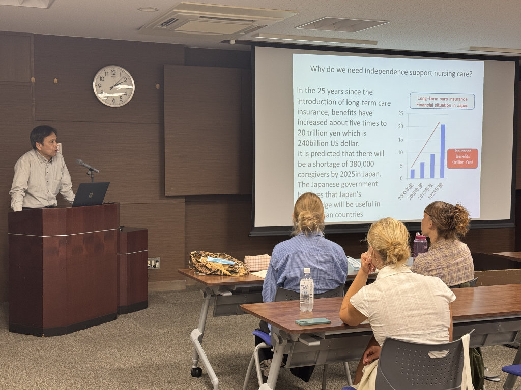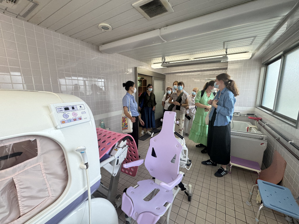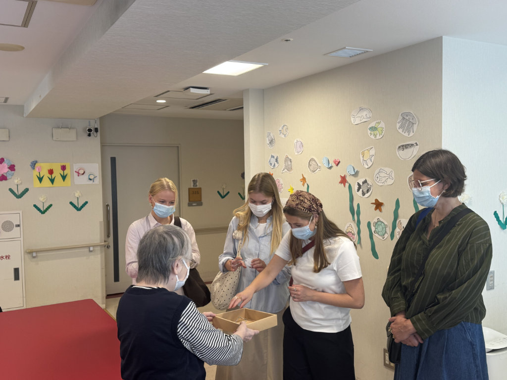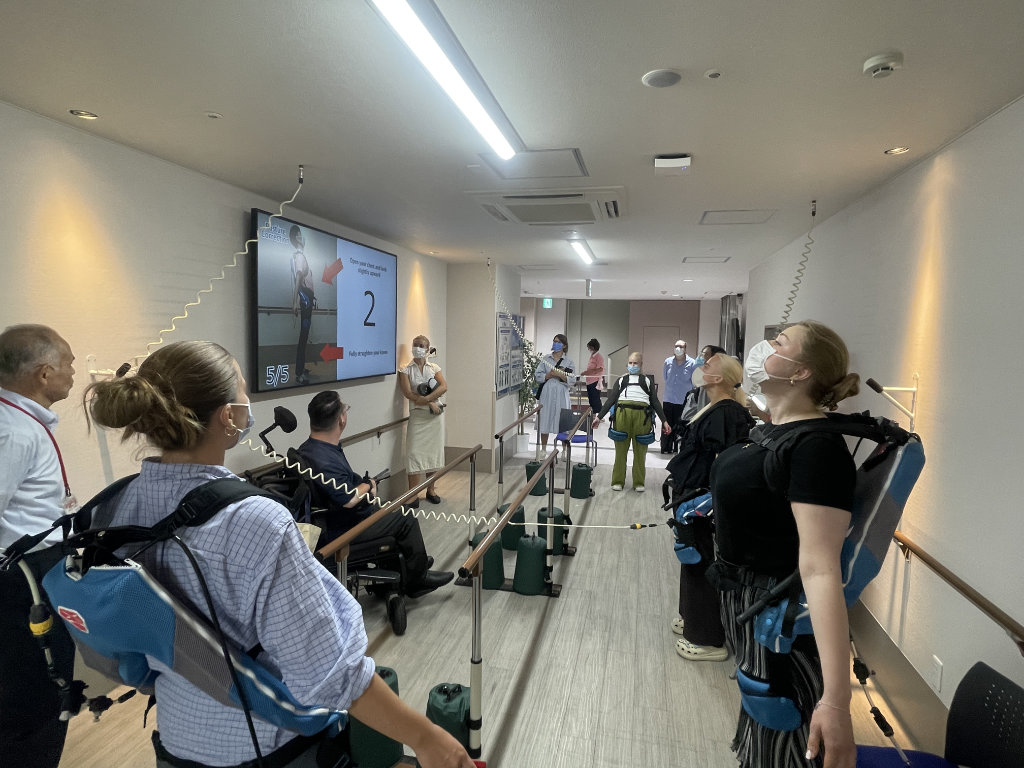 一行はまず特定施設ケアハウスであるアゼリーアネックスを訪れ、日本における高齢者ケアの現場を視察していただきました。その後、地域共生複合施設であるA-Cubeに移動し、保育園児、高齢者デイサービス利用者、障がいのある方々が共に活動する様子を見学し、更に、認知症や感覚障がいを持つ方々のために設けられた多感覚療法室「スヌーズレンルーム」や、姿勢の改善や出産後の骨盤の安定を助ける「マッスルスーツ」の体験もされました。